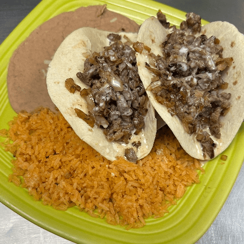 Two flour tortillas stuffed with thin steak slices cooked with onions and covered with cheese sauce. Served with rice and beans.
