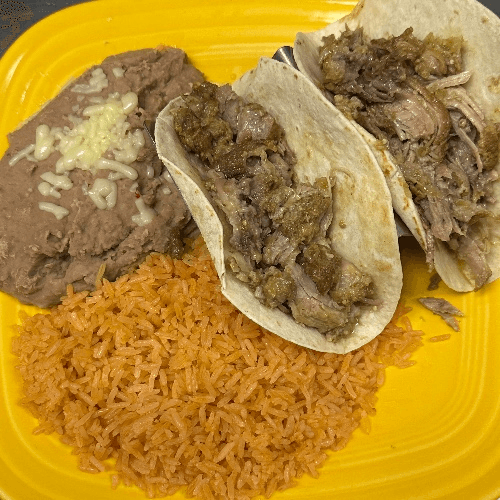 Two pork tacos filled with chopped carnitas and tossed with tomatillo sauce. Served with rice and beans.