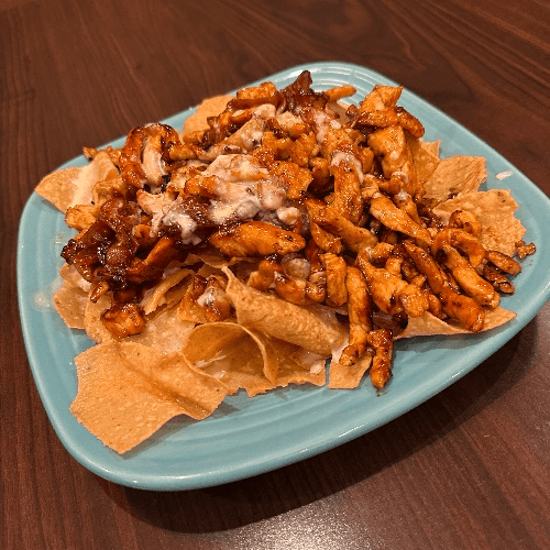 Grilled Shrimp tossed with BBQ sauce, served over chips covered with cheese sauce.
