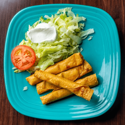 4 fried & rolled corn tortillas, stuffed with shredded chicken or beef. Served with lettuce, & sour cream.