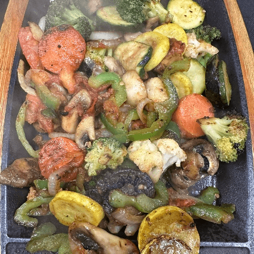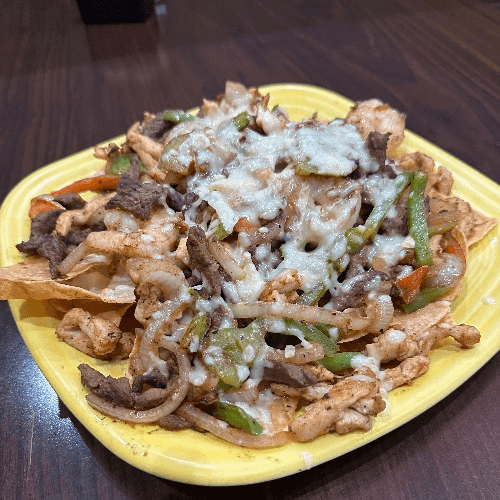 Steak, chicken, mushrooms mixed with fajita vegetables and covered with melted cheese.