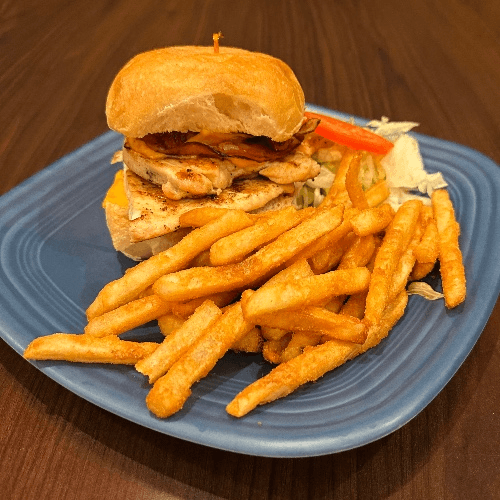 Grilled chicken breast with melted cheese, lettuce, and tomatoes. Served with a side of fries.