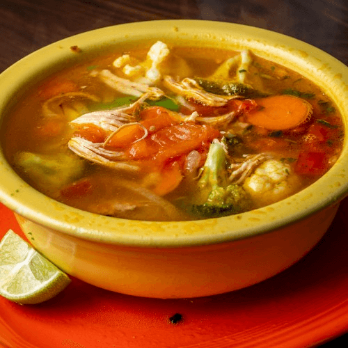 A zesty blend of chicken broth filled with tender chicken, cooked vegetables, rice, pico de gallo and sliced avocado.