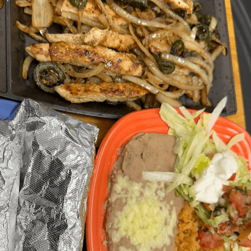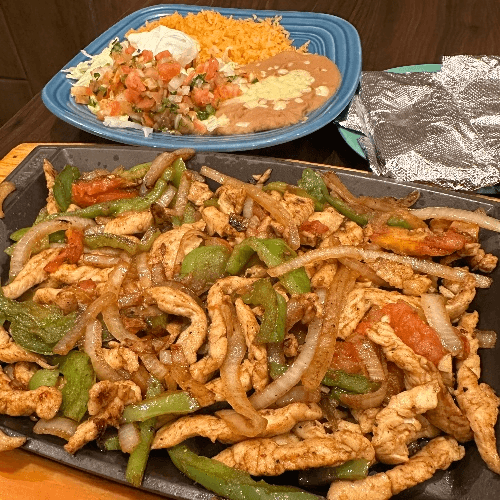 Grilled chicken fajita, mixed with grilled jalapeños and onions. Served with Rice and beans.