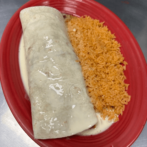 Regular size burrito with your choice of steak or chicken. Topped with cheese sauce.