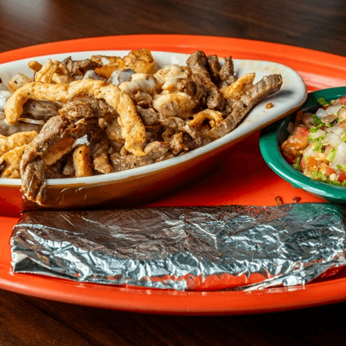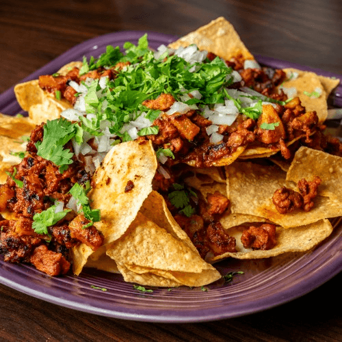 Our traditional Al Pastor meat over a layer of cheesy nachos, topped with chopped cilantro and onion.