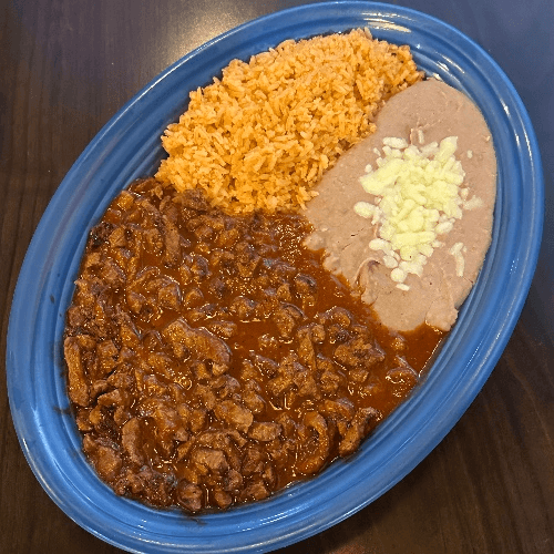 Steak chunks mixed with red chile sauce. Served with rice, beans and tortillas.