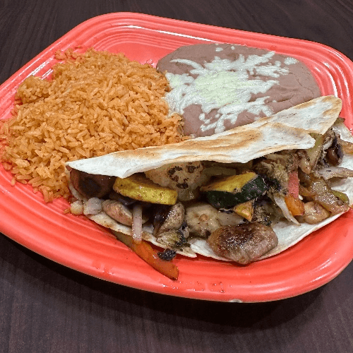 Steak, grilled chicken, shrimp, with onions, bell peppers, tomatoes. Served with rice and beans