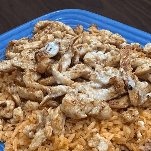 Grilled chicken or steak strips served over a bed of rice & cheese sauce.