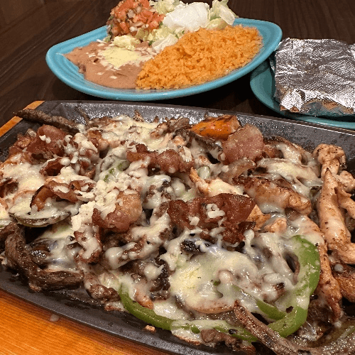 Delicious fajita stew of steak, chicken and shrimp, sauteed in a mild spicy sauce with onions and tomatoes, topped with melted cheese. Served with a side salad, rice and beans.