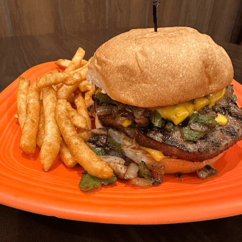 8 oz. Patty topped with cooked onions, peppers, mushrooms, and extra cheese.